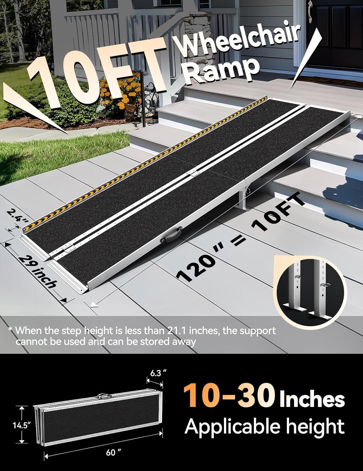 ⚠WHEELCHAIR RAMP 10FT】 (10FT Unfolded Size: 120″x29″x2″, Folded Size:60″x14.5″x 6.3”) It is recommended to use a height of 10 inches – 30 inches(It is not recommended to choose a wheelchair ramp with a length less than four times the height of the steps.). The 10FT ramp weighs 71 pounds due to its large size, so it is recommended that multiple people carry it.Buyers please refer to the size guide before purchasing ramps. The maximum load of the wheelchair ramp is 800lbs. ▶ It is normal for a long ramp to sink during use, it will rebound shortly afterwards.
