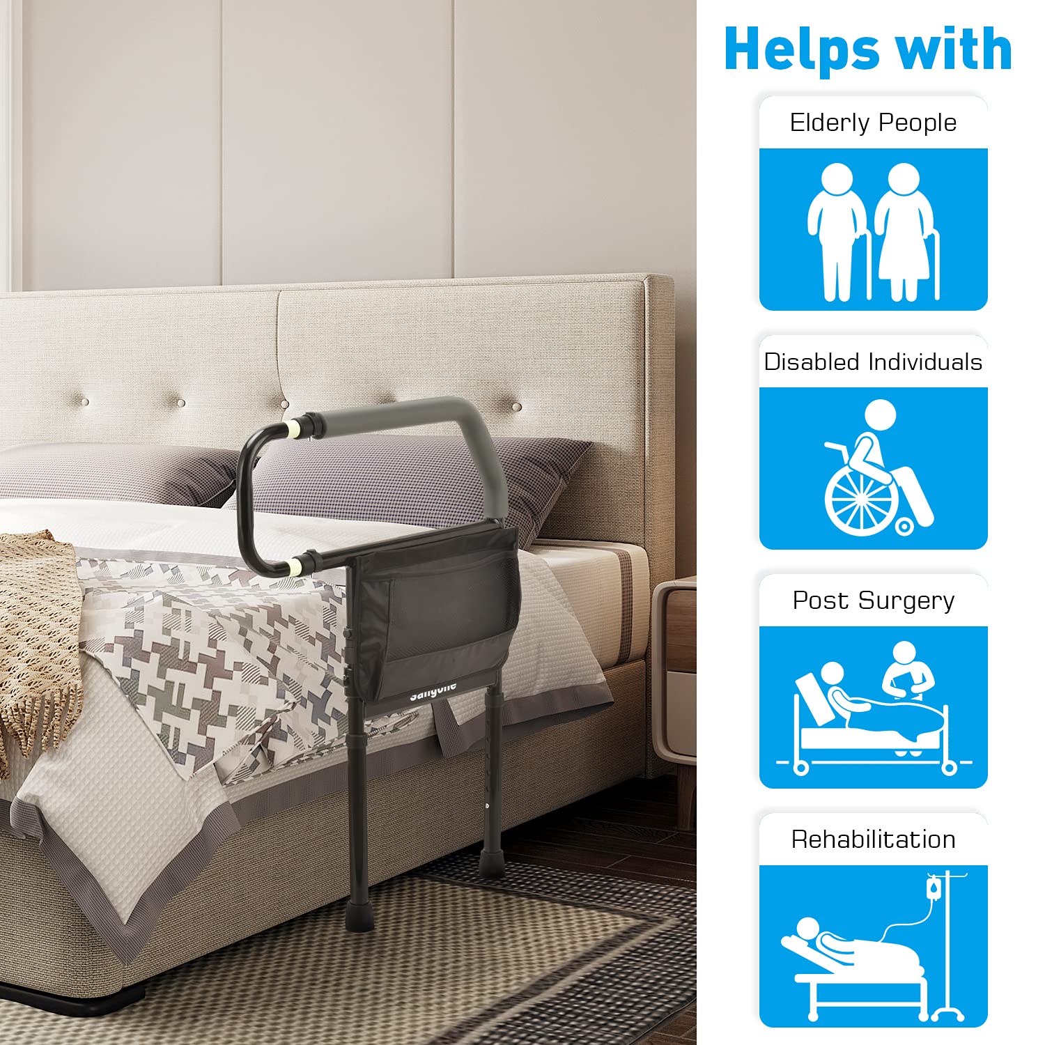 Sangohe Bed Rail for Elderly, Bed Assist Grab Bar Handle with Storage Pocket, Safety Bed Rails for Elderly Adults Getting in & Out of Bed at Home and Dorm – Fit King, Queen, Full, Twin