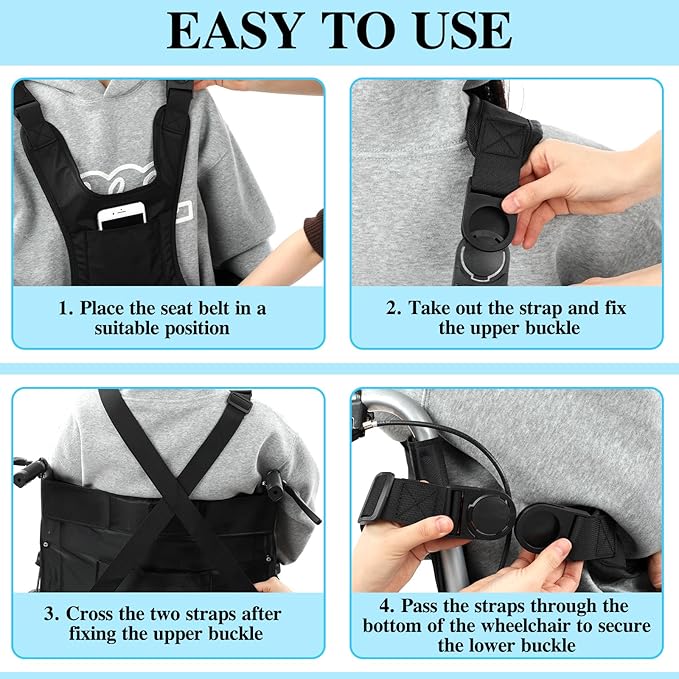 Easy to Wear: the wheelchair seatbelts for adults adopt universal round buckles, easy to wear and adjust, just wear the seat belt on the body, and then buckle up and down, left and right straps, and finally adjust the belt to the appropriate size as needed